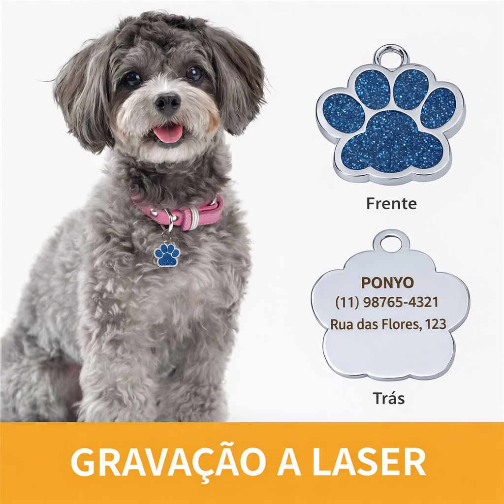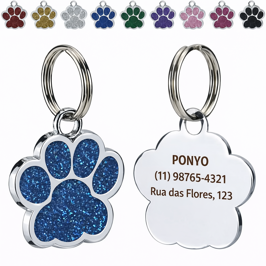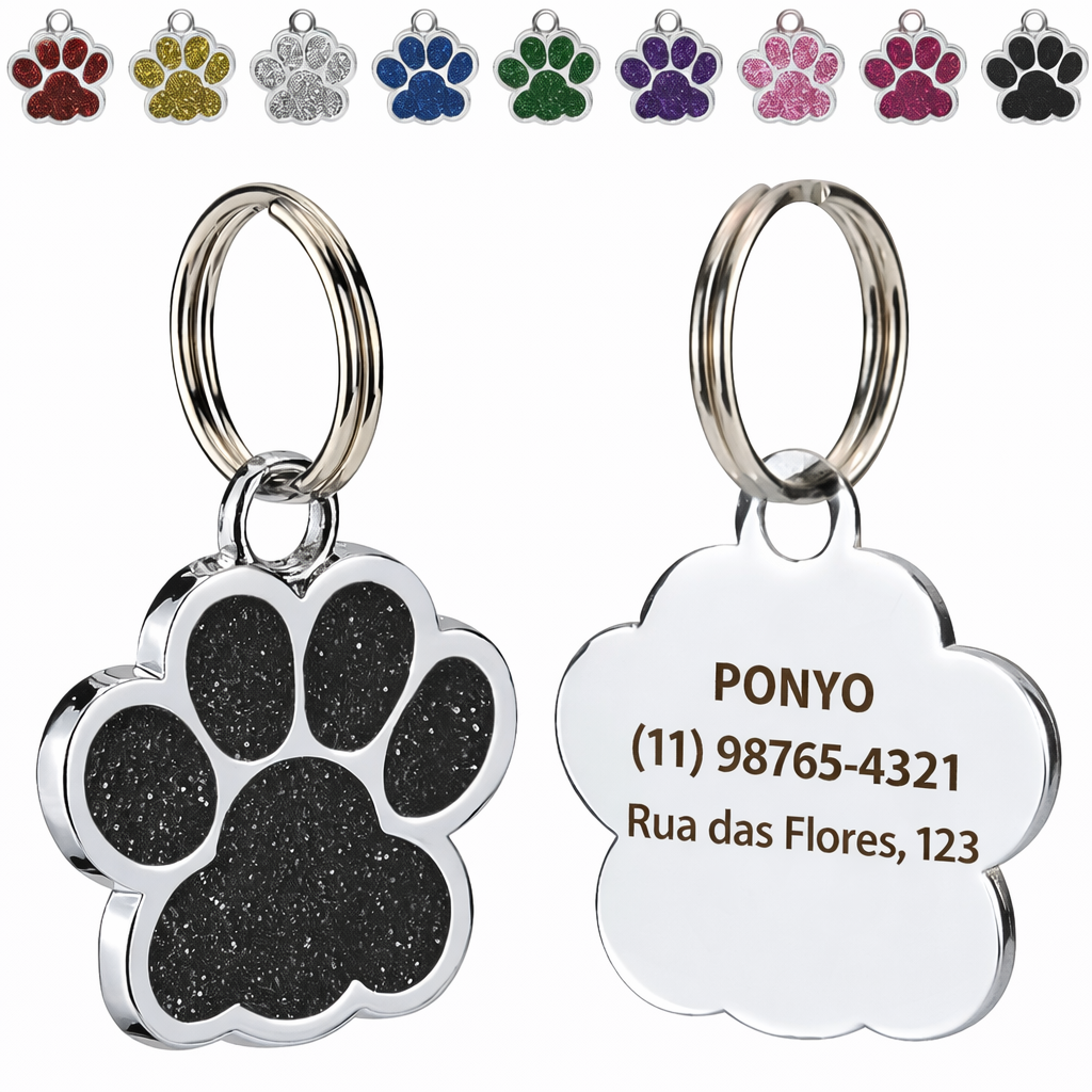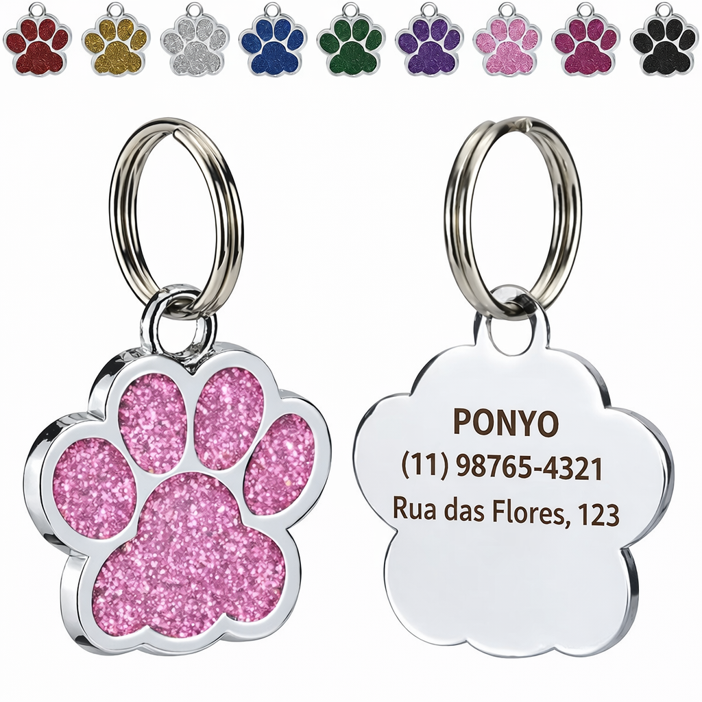 O GlowPet Tag é um pingente de identificação personalizado que une segurança, estilo e praticidade para o seu pet. Com formato de patinha e acabamento com glitter elegante, ele permite gravar informações importantes como nome do pet, telefone e endereço do tutor, ajudando a identificar rapidamente seu animal caso ele se perca.