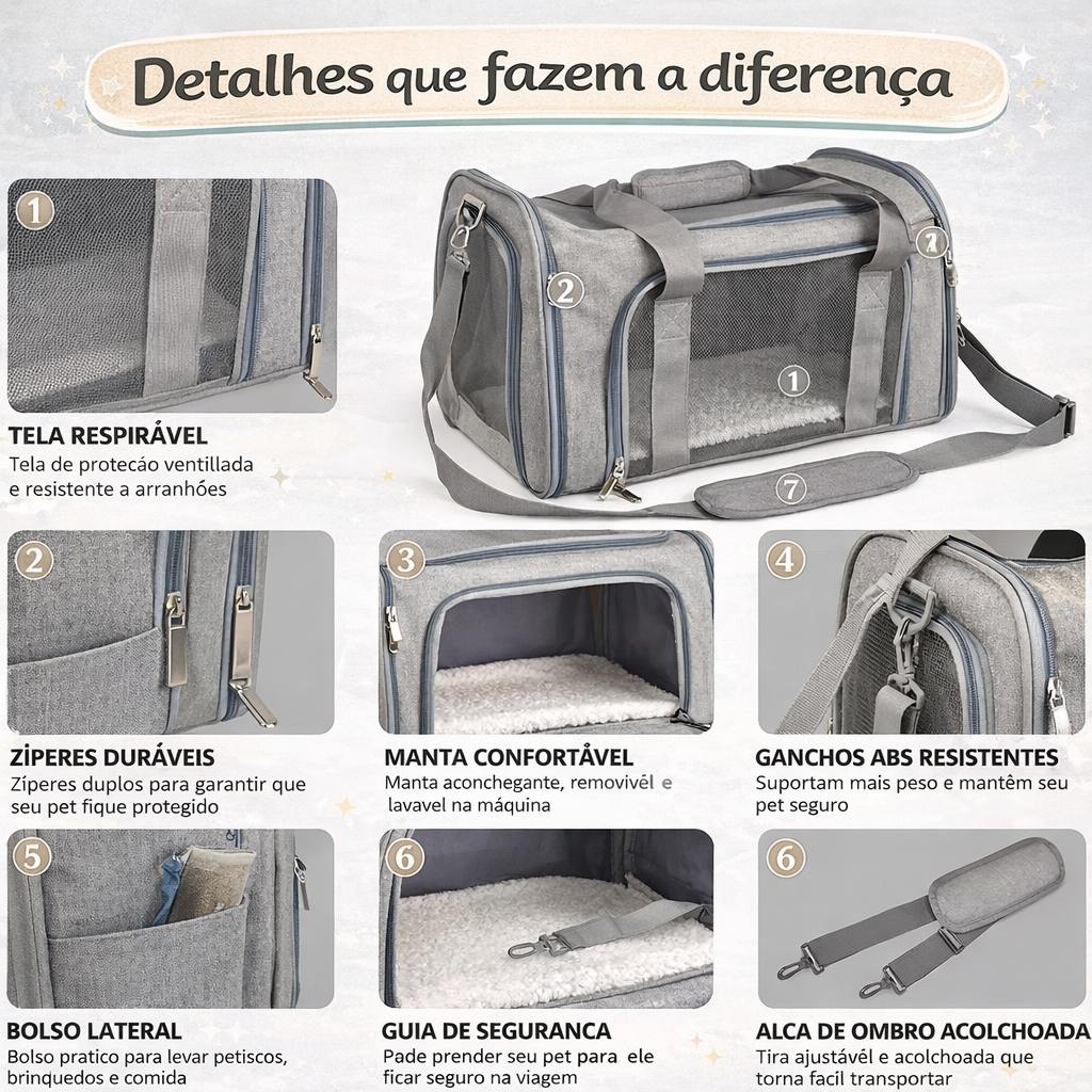 Perfeita para passeios, viagens, transporte no carro ou visitas ao veterinário.